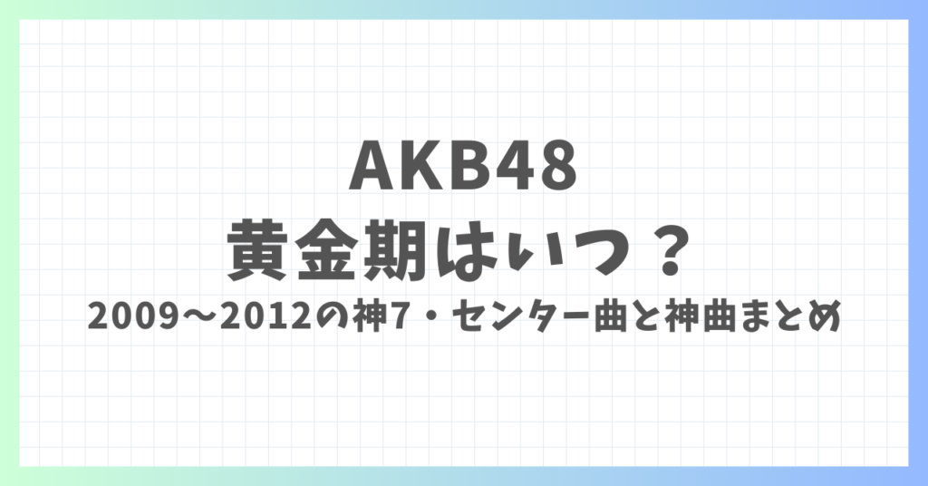 AKB48の黄金期(黄金時代)は、一般的に2009〜2012年前後(「ポニーテールとシュシュ」「ヘビーローテーション」などが社会現象級にヒットし、選抜総選挙やメディア露出が最大化していた時期)を指すことが多いです。 この記事では、黄金期の中心だった神7... -