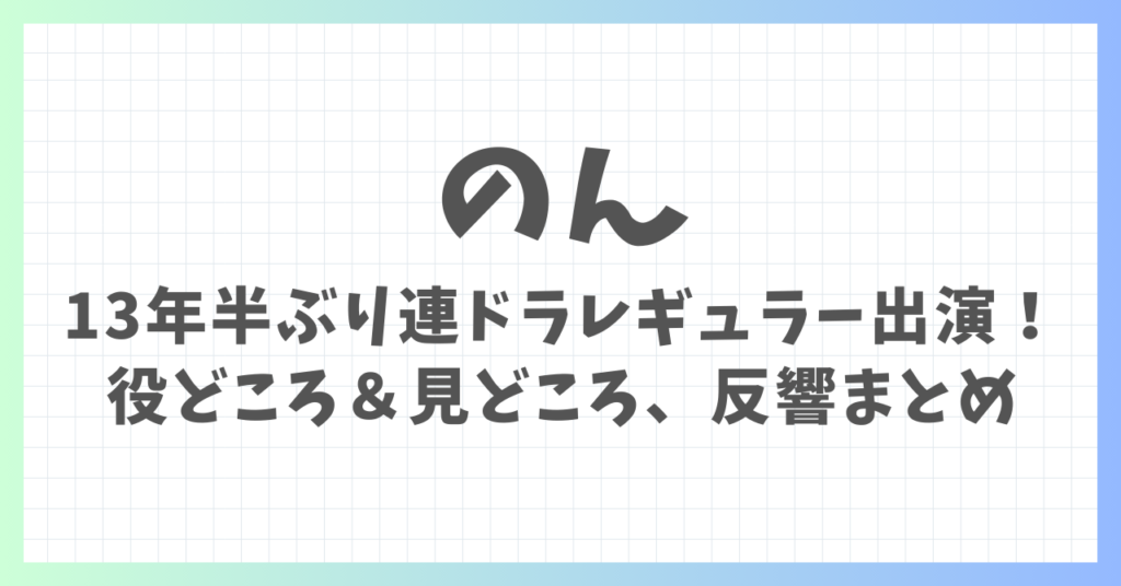のんさんが、地上波の連続ドラマに“レギュラー出演”するというニュースが大きな話題になっています。 出演作は中京テレビ・日本テレビ系の水曜プラチナイト『こちら予備自衛英雄補?!』。 民放連ドラでのレギュラーは約13年半ぶりとされ、放送開始前から「... -