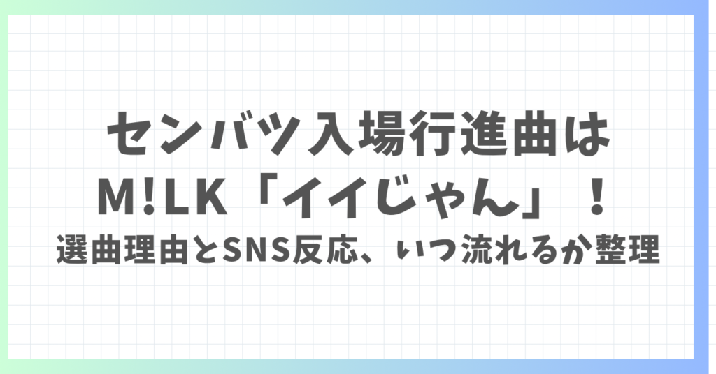 第98回選抜高校野球大会(センバツ)の開会式入場行進曲が、M!LKの「イイじゃん」に決定しました。 発表直後から「意外!」「春っぽくて合いそう」「ブラスで聴いたら絶対アガる」とSNSも一気に沸騰。 この記事では、なぜ「イイじゃん」が選ばれたのか(選... -