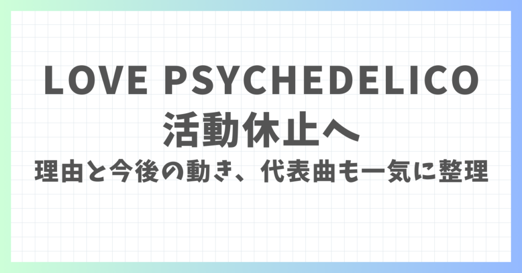 LOVE PSYCHEDELICO(通称:デリコ)が「25周年ツアーをもって活動休止する」と発表し、驚きとさみしさが広がっています。 デビューから長く愛されてきたユニットだけに、「いつから休止?」「理由は?」「解散じゃないの?」「今後はどうなる?」が気にな... -