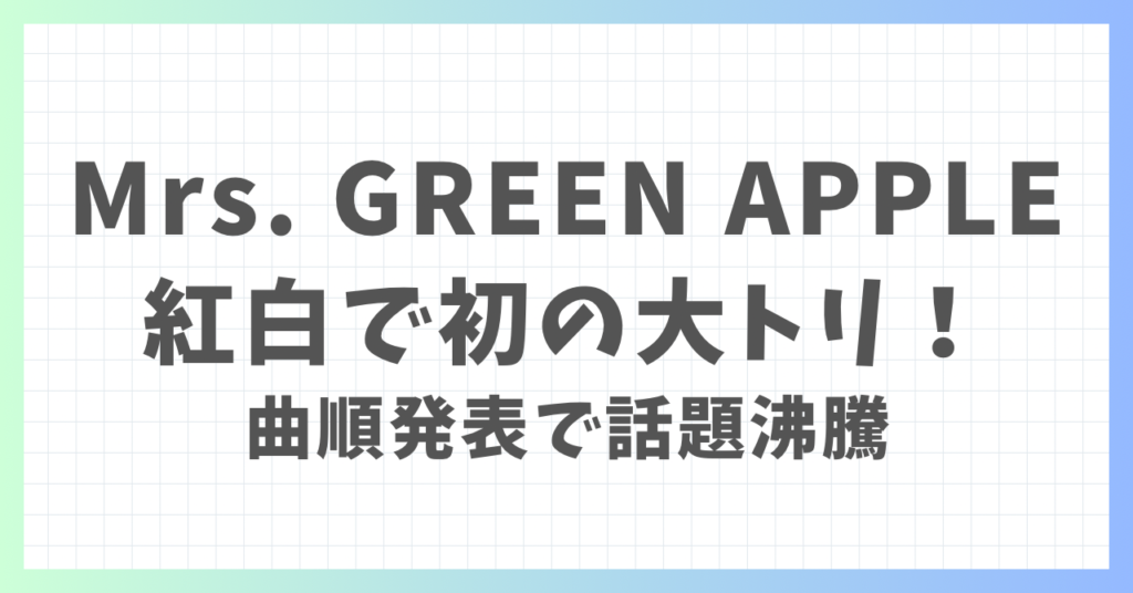 2025年の大みそかに放送されるNHK紅白歌合戦で、Mrs. GREEN APPLE(ミセス)が白組の大トリを務めることが、曲順発表とともに明らかになりました。 ミセスにとっては紅白3回目の出場にして初の大トリとなり、SNSでは驚きと祝福の声が一気に広がっています... -