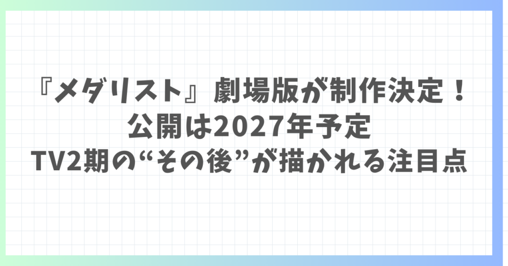 フィギュアスケート漫画原作のアニメ『メダリスト』に、ついに劇場版(映画)が来ます。 発表されたのはTVアニメ第2期の先行上映会の場で、劇場版は2027年公開予定。 しかも総集編ではなく、TVアニメ第2期の“その後”のストーリーを描くと明言され、ファン... -