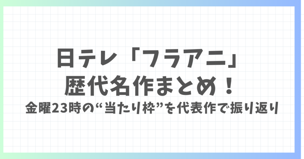 日テレ金曜23時のアニメ枠「FRIDAY ANIME NIGHT(通称:フラアニ)」は、スタートからわずか数年で“金曜深夜=アニメの強枠”という印象を作った存在です。 2026年4月期には枠が1時間に拡大することも決まり、ますます注目度が上がっています。 この記事で... -