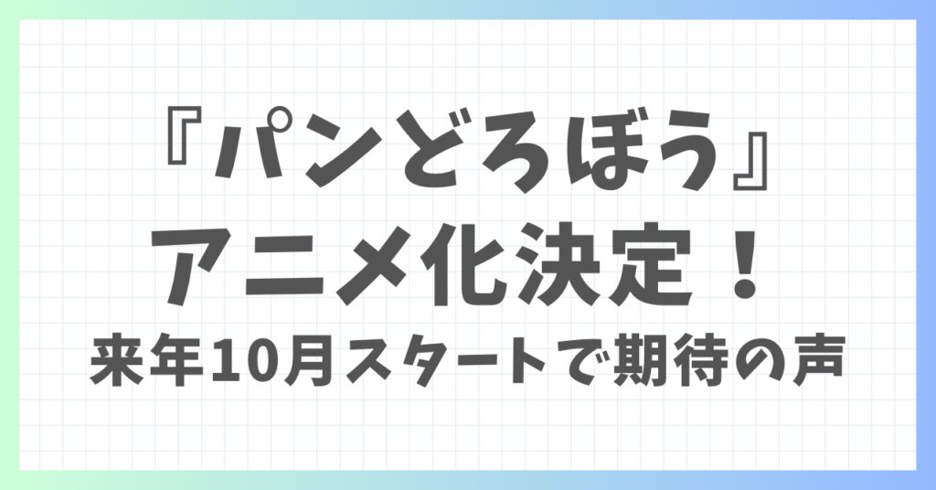 絵本シリーズ『パンどろぼう』が、ついにテレビアニメ化され、来年10月から放送スタートすることが明らかになりました。 子どもたちを中心に圧倒的な人気を誇る作品だけに、「待ってました!」「絶対見る!」と期待の声が続々。 この記事では、『パンどろ... -