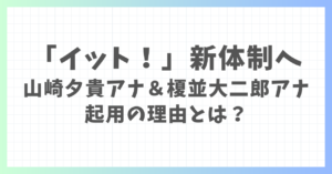 - フジテレビ:イット!(現行:青井実・宮司愛海・遠藤玲子/来春:榎並大二郎・山崎夕貴・遠藤玲子の新体制報道)