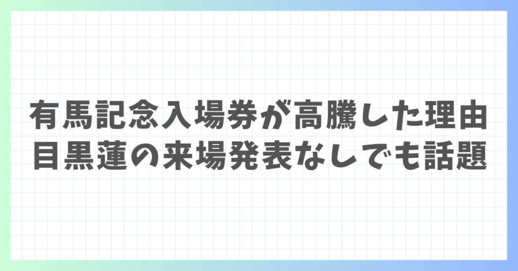 「目黒蓮さんの来場発表がないのに、有馬記念の入場券が“プラチナ化”している」と話題です。 背景には、そもそも有馬記念当日の中山競馬場が“ネット事前購入者のみ入場可(当日券なし)”という仕組みがあるうえで、目黒さんと競馬の“接点”が今年は強く、期...
